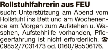 Rollstuhlfahrerin aus FEU sucht Unterstützung am Abend vom Rollstuhl ins Bett und am Wochenende am Morgen zum Aufstehen u. Waschen, Aufstehhilfe vorhanden, Pflegeerfahrung ist nicht erforderlich.