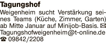 Tagungshof Weigenheim sucht Verstärkung seines Teams (Küche, Zimmer, Garten) ab Mitte Januar auf Minijob-Basis.