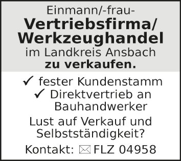 Einmann/-frau-Vertriebsfirma/Werkzeughandel im Landkreis Ansbach zu verkaufen.