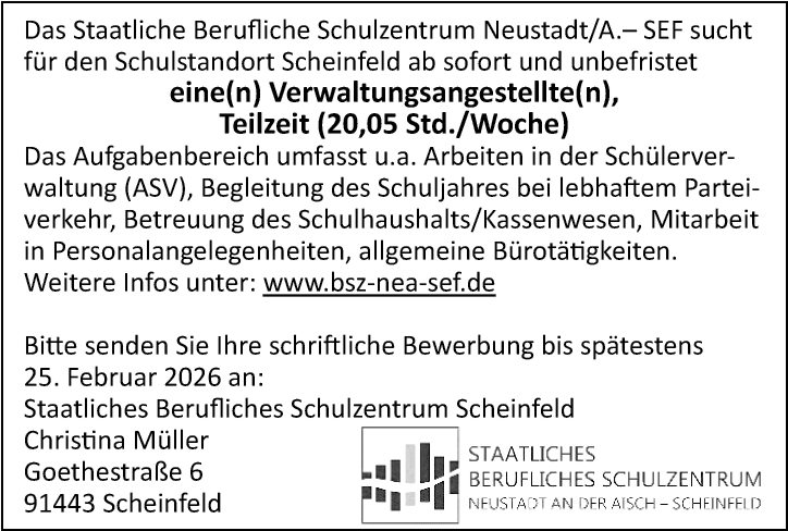 Das Staatliche Berufliche Schulzentrum Neustadt/A.– SEF sucht für den Schulstandort Scheinfeld ab sofort und unbefristet eine(n) Verwaltungsangestellte(n), Teilzeit (20,05 Std./Woche).
