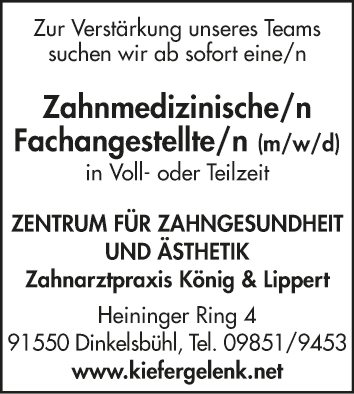 Zur VerstÀrkung unseres Teams suchen wir ab sofort eine/n Zahnmedizinische/n Fachangestellte/n (m/w/d) in Voll- oder Teilzeit.