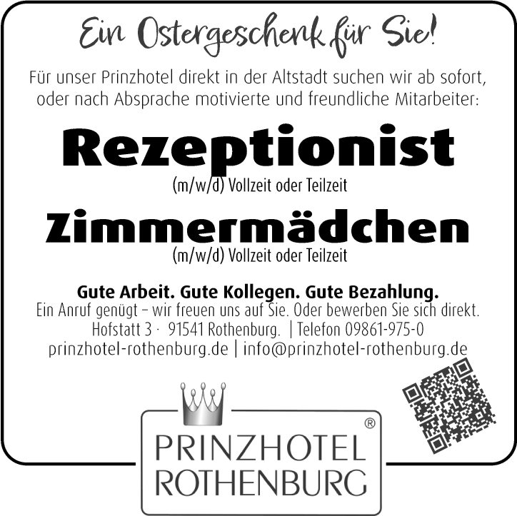 Für unser Prinzhotel direkt in der Altstadt suchen wir ab sofort, oder nach Absprache motivierte und freundliche Mitarbeiter: